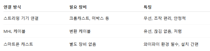 MHL 케이블은 대부분 1만 원 이하의 가격으로 구입 가능하며, 스마트폰과 TV를 직접 연결할 수 있습니다.- 스마트폰의 MHL 포트와 TV의 HDMI 포트를 케이블로 연결합니다.