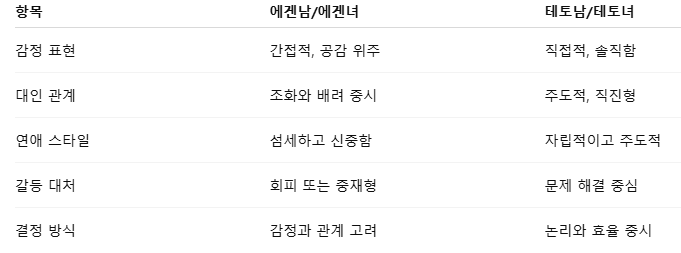에겐 유형은 관계 중심의 감성형, 테토 유형은 문제 해결 중심의 이성형이라고 이해할 수 있습니다.